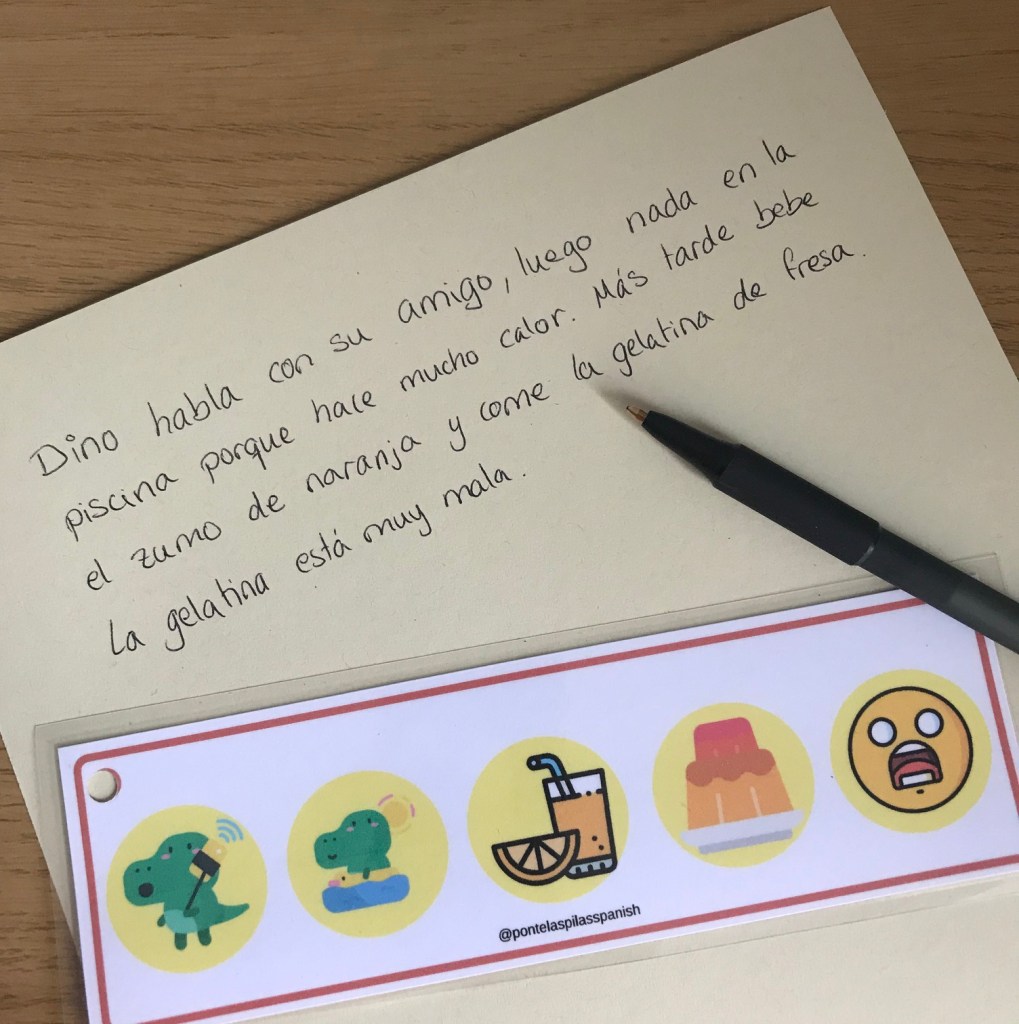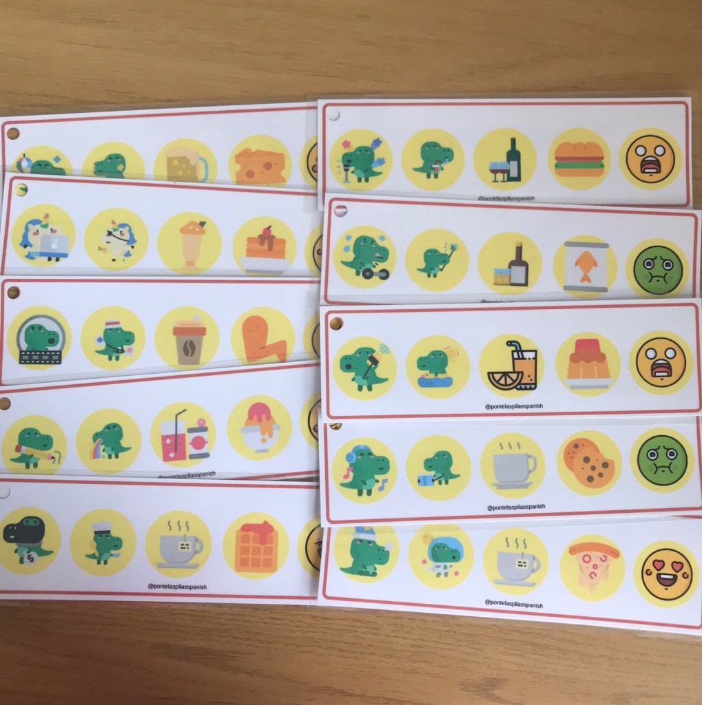- 10 tiras con 5 imágenes – cada tarjeta contiene dos actividades, una bebida, una comida y una emoción.