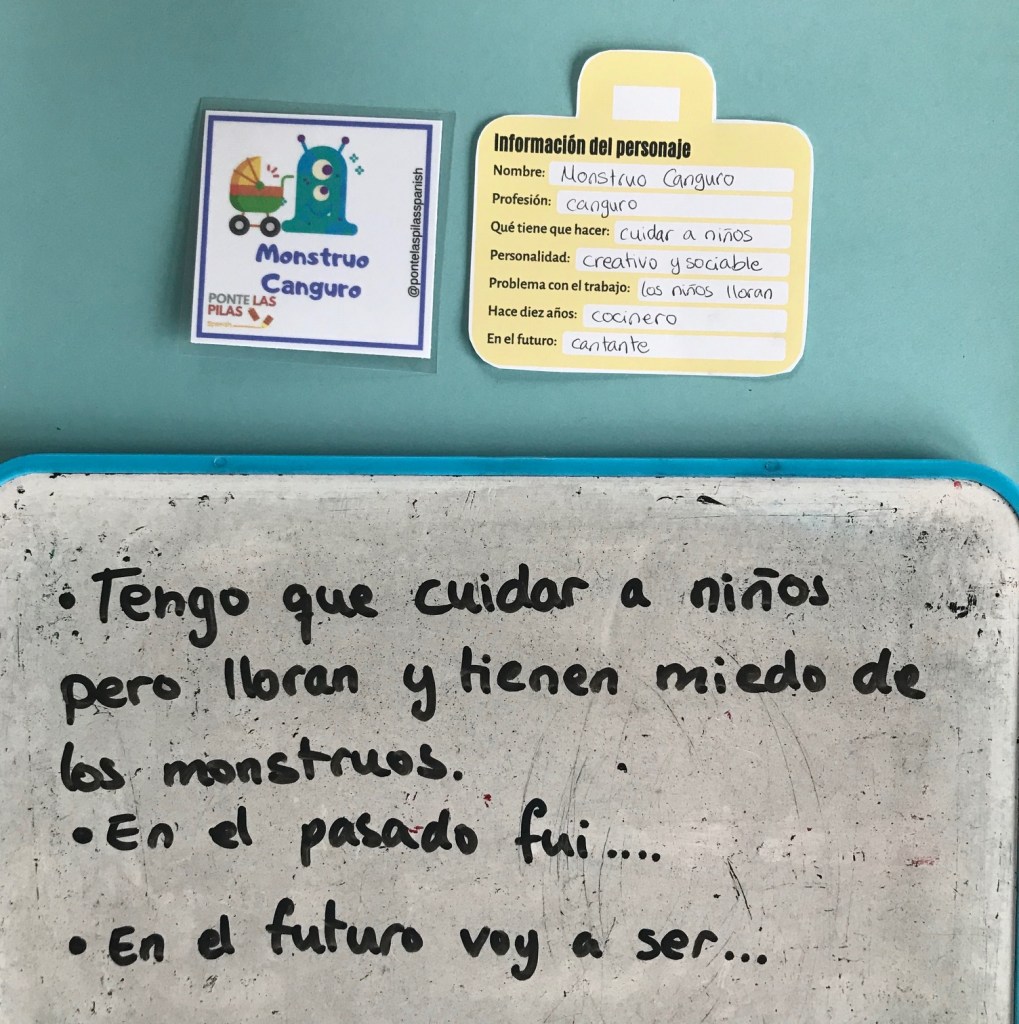 - Personajes cómicos y maletines; en esta actividad los estudiantes serán unos personajes un tanto peculiares con una profesión que parece ser que no sea la adecuada. Cada alumno escoge una tarjeta de personajes y prestando atención al nombre del personaje, escribe información en el maletín sobre su personaje para luego compartirlo hablando con sus compañeros. El objetivo es que practiquen los tres tiempos verbales, empezando por cuáles son sus tareas en el trabajo y por qué es un problema, luego a qué se dedicaba en el pasado, y finalmente, qué va a hacer en el futuro. Ej. Monstruo Canguro: tengo que cuidar de los niños y ser muy paciente pero es un problema porque los niños tienen miedo de los monstruos y siempre lloran. En el pasado trabajé como diseñador de gorros. En el futuro me gustaría trabajar como cantante porque soy muy ambicioso y creativo.