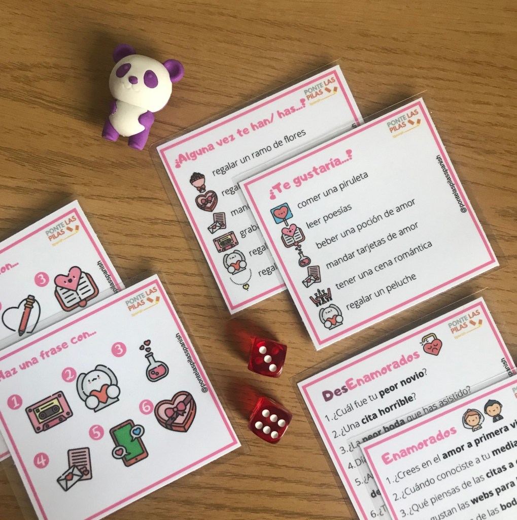 - Tarjetas «enamorados» y «desenamorados»: para los niveles intermedios, leemos las preguntas entre todos y nos aseguramos que los alumnos conocen el nuevo vocabulario en negrita. Si alguno no lo conoce, otro alumno le puede describir en español el significado de la palabra. Después por parejas o grupos hacemos una conversación de las distintas preguntas. Luego se pueden comentar las repuestas en grupo y decir cuáles han sido las respuestas más sorprendentes y divertidas o raras.