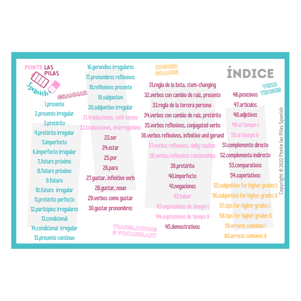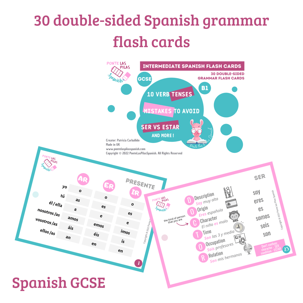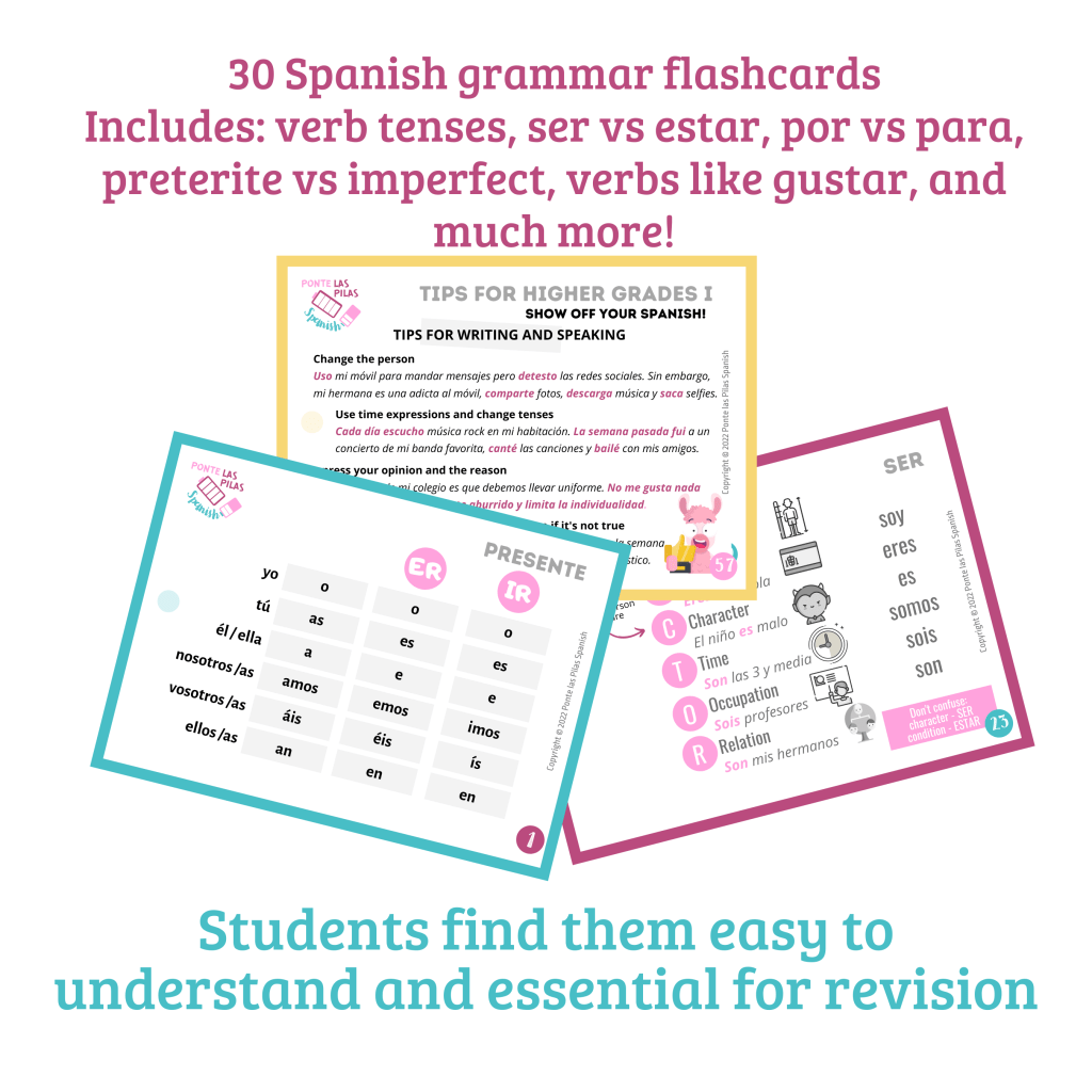 ¿Cuántas veces os preguntan los estudiantes sobre ser o estar, el complemento directo, por o para, formas verbales, los reflexivos, el subjuntivo, verbos stem changing….etc? Y vosotros decís…allá vamos otra vez con la explicación y los ejemplos…. Para la próxima vez, estaréis preparados para sacarle justo la tarjeta exacta que necesitan para recordar la gramática que tenían oxidada.