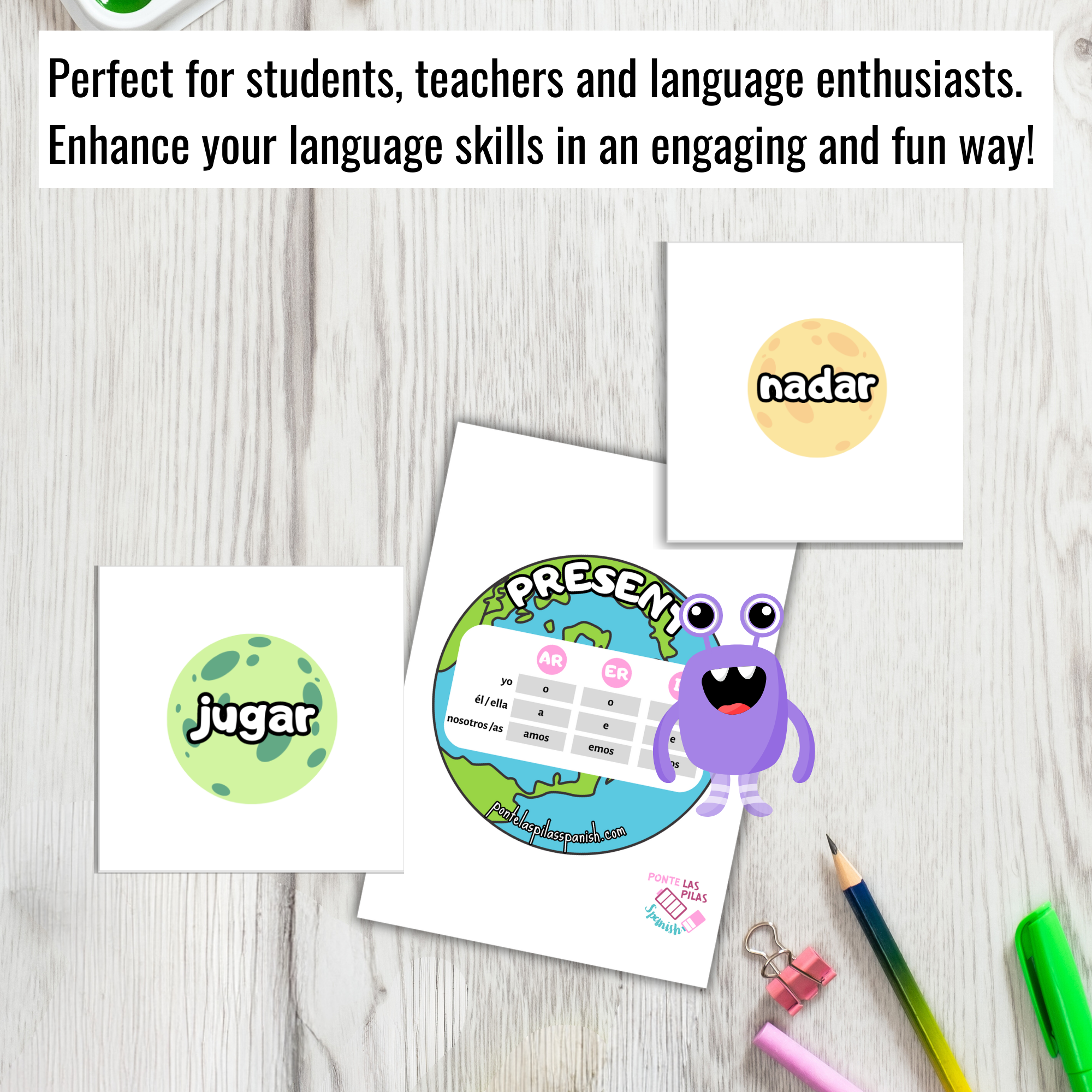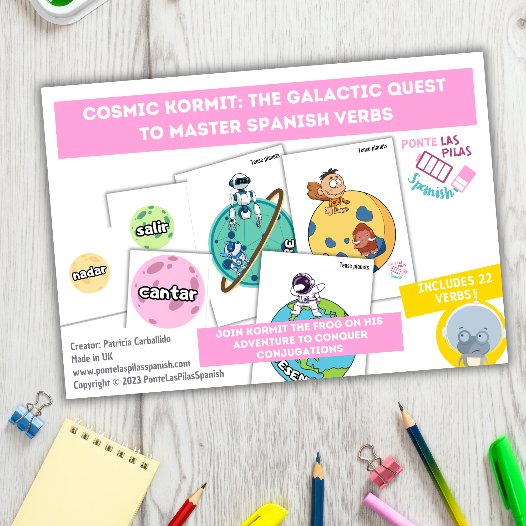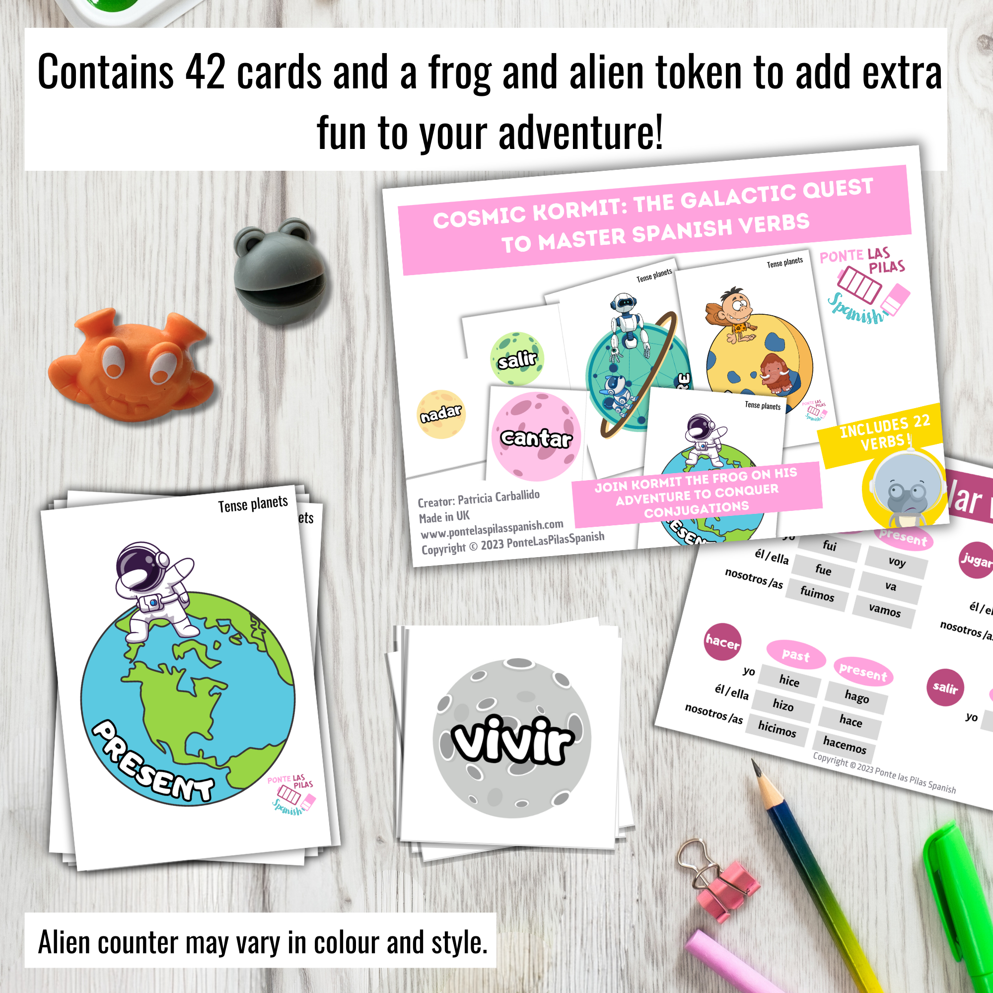 ¡Embárcate en un viaje cósmico de aprendizaje de idiomas con Cosmic Kormit! Elaborado por un tutor nativo de español, este cautivador juego de cartas da vida al universo de los verbos en español de una manera tangible y atractiva.