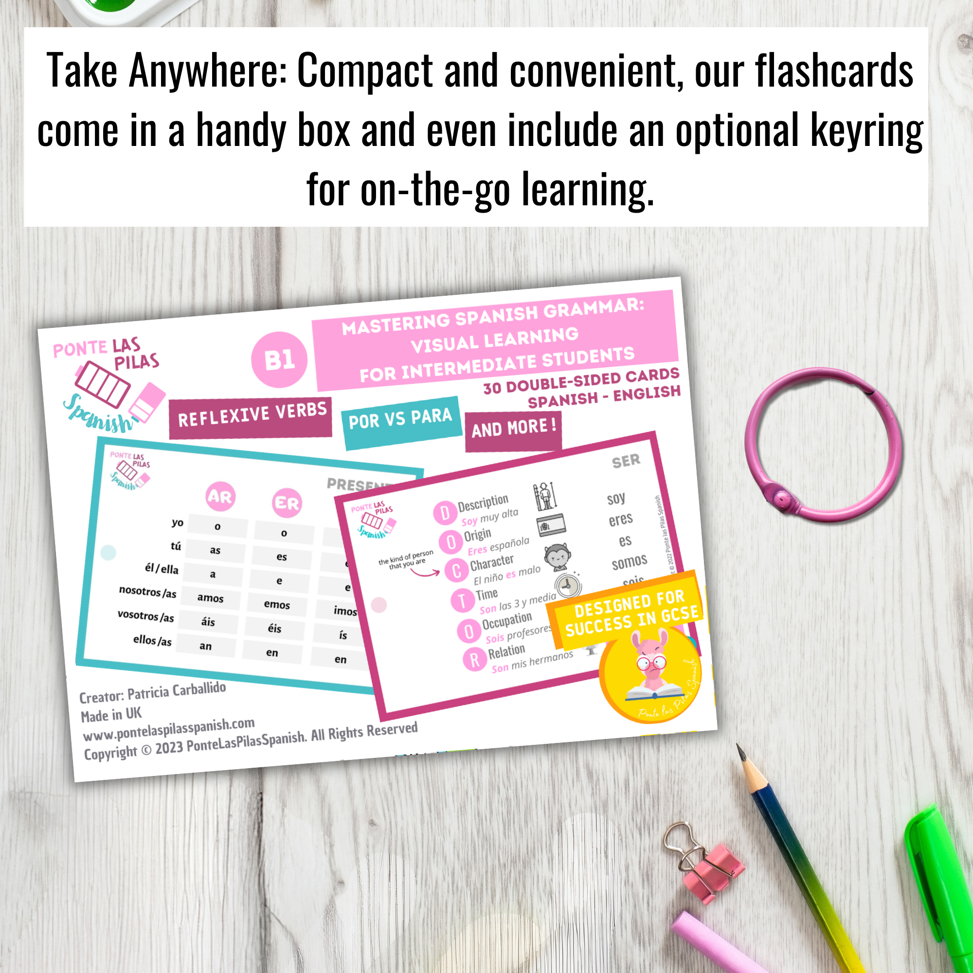 ¡Bienvenido al mundo de las flashcards de gramática esencial en español, tu herramienta definitiva para dominar el español a nivel intermedio y arrasar en los exámenes de GCSE!